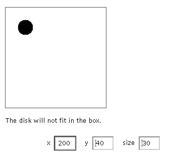 Let us have a look at the following applet. Note that the disk may leave the box, e.g. take x=200, y=100, size = 50. Suppose this is unwanted behaviour.