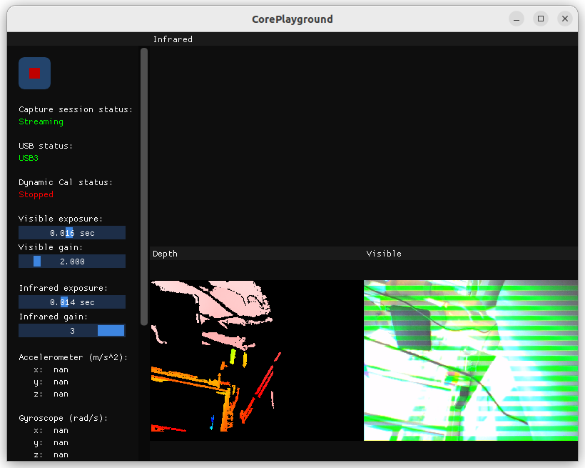 The CorePlayGround indicated After Structure Core is connected FW version 1.0.0-release. Most of it works, although I don't see anything in the InfraRed window, green stripes in the Visual window, but nice Depth images: