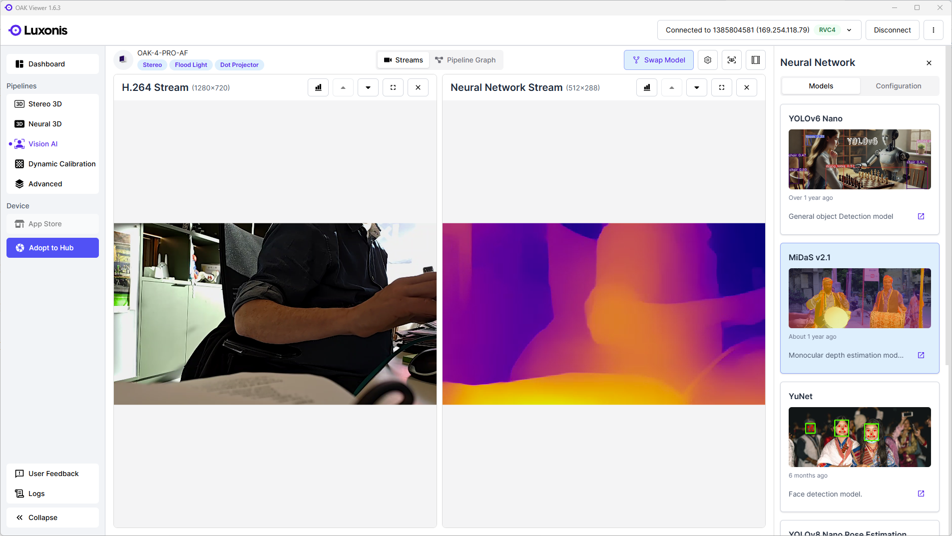 - The OAK-D was found, the OAK-D light turned green and I got a view: